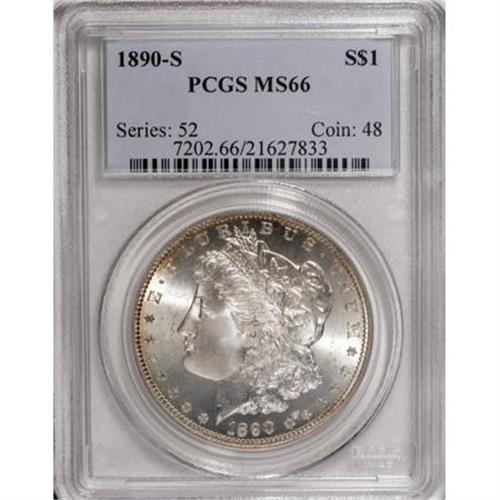 <B>1890-S $1 MS66 PCGS.</B></I> Medium gold toning adorns the rims of this highly lustrous Premium Gem, while the fields and devices are brilliant. Beautifully preserved, and a good strike with only moderate inexactness on the curl above the ear. PCGS has certified a mere five pieces finer (2/08).<BR><BR><B>Coin Engraver:</B> George T. Morgan<BR><BR><b>Shipping:</b> Coins & Currency (<a target="_blank" href="http://www.heritageauctions.com/common/shipping.php">view shipping information</a>)