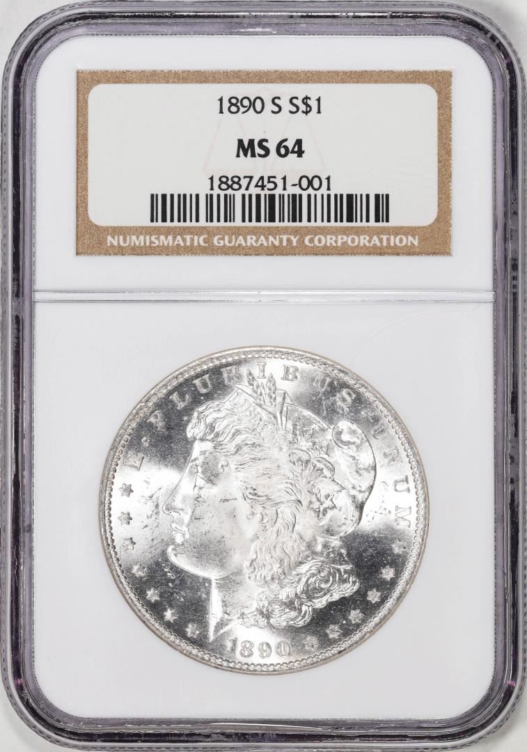 One 1890-S $1 Morgan Silver Dollar Coin NGC MS64. NGC Certified.