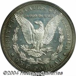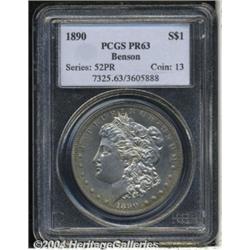 <B>1890<S$1> PR63 PCGS.</B></I> Ex: Benson. Golden-brown, aqua, and electric-blue colors endow this meticulously struck specimen. A few wispy hairlines are visible in the field beneath Liberty's chin, but these do not deny the eye appeal. One of the lowest mintages in the proof Morgan Dollar series. A stingy 590 pieces were produced, less than all but the first and final dates of the popular series. <BR><BR><B>Important notice:</B> Heritage usually auctions material at the rate of 200-250 lots per hour. On some occasions eBay Live bid software or the Internet may not be able to keep up with the pace of the auction. We recommend placing a realistic absentee bid now as insurance to avoid disappointment. Occasionally the auctioneer may eliminate or reject an eBay Live bid, and the auctioneer may also reopen a lot after the close of the eBay live bidding (usually because we missed an audience bid), and may reject your bid even if it shows you as the winning bidder. By bidding via eBay Live, you agree that Heritage may award the lot to another bidder at its sole discretion under the circumstances described above or any other reasonable circumstances. Since eBay bids are not shown to us until we open the lot on the floor, we treat those bids just like floor bids. In most cases the floor responds before the eBay bid is presented to us, due to Internet lag time, so for consistency we have made it a policy that floor bids are always considered first over tie eBay live bids. Also please note that all Heritage lots purchased through eBay Live carry a 20% Buyer's Premium. Please make sure you read the Terms and Conditions before you bid. </span></font></tr></table></td></tr></table>