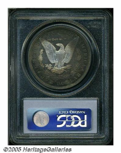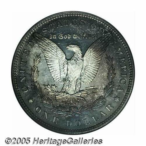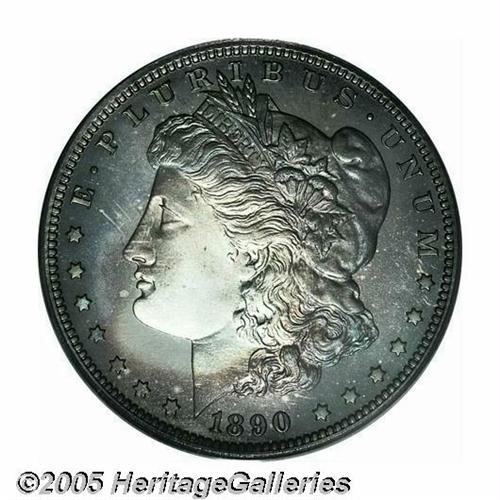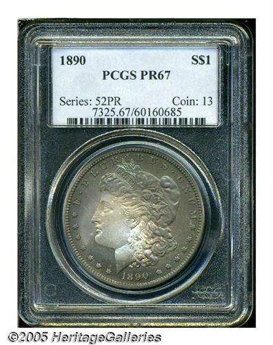 <B>1890<S$1> PR67 PCGS.</B></I> An exemplary specimen bathed in natural rose-gray, russet, and aqua toning that yields to relatively small areas of brilliance on each side. The strike is very well executed, not always a given on this briefly minted (just 590 pieces) proof Morgan. Population: 13 in 67, 1 finer (5/05).<BR><I>From The Western Hills Collection.</B></I>
