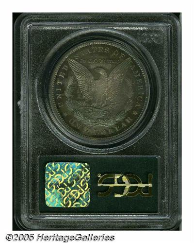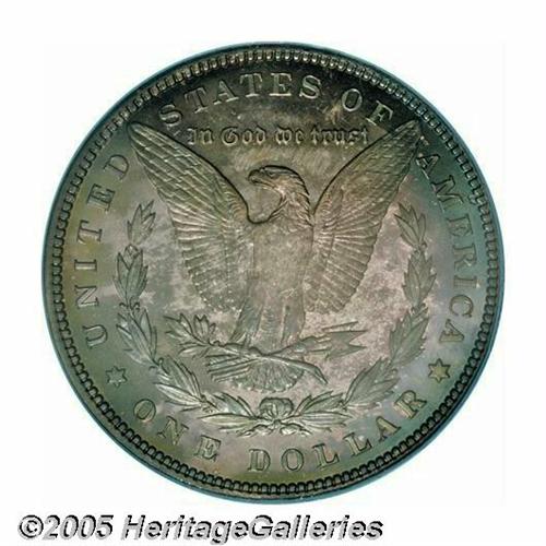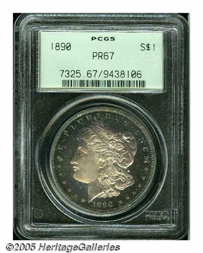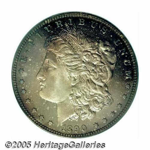 <B>1890<S$1> PR67 PCGS.</B></I> Simply gorgeous. One of the nicest examples we've ever seen and virtually devoid of any but the most trivial flaws. Vivid intermingled shades of gold, blue, and violet complement both surfaces. Here is an example that has always been carefully and lovingly handled during the eleven and a half decades that have transpired since it was issued; something which makes this piece an important condition rarity suitable for inclusion in the very finest of cabinets. Only 590 proof dollars were issued during the year, a figure which lacks substantial meaning in light of the fact than no more than just a few of them could match the quality offered here. Population: 13 in 67, 1 finer (3/05).