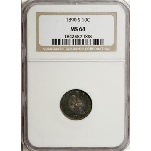 <B>1890-S 10C MS64 NGC.</B></I> An attractive near-Gem with sea-green, rose, and amber toning over both sides. Boldly struck and free of distracting marks. A better date in the Seated dime series, with a mintage of 1.4 million pieces. Census: 20 in 64, 20 finer (8/07).<I> From The Beau Clerc Collection.</B></I><BR><BR><B>Coin Engraver:</B> Christian Gobrecht<BR><BR><b>Shipping:</b> Coins & Currency (<a target="_blank" href="http://www.heritageauctions.com/common/shipping.php">view shipping information</a>)