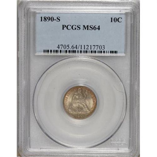 <B>1890-S 10C MS64 PCGS.</B></I> Medium autumn-gold and cream-gray toning graces this lustrous and precisely struck near-Gem. Splendidly smooth and desirable. An unusual clash mark is noted beneath the DI in DIME, an interesting project for the numismatic researcher. Population: 11 in 64, 8 finer (4/07).<BR><BR><b>Shipping:</b> Coins & Currency (<a target="_blank" href="http://www.heritageauctions.com/common/shipping.php">view shipping information</a>)
