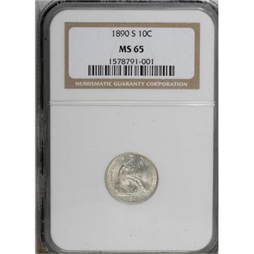 <B>1890-S 10C MS65 NGC.</B></I> A delightful representative of this late-date S-mint issue, strongly lustrous with minimal patina. Carefully preserved with excellent detail. Census: 12 in 65, 8 finer (9/07).<BR><BR><B>Coin Engraver:</B> Christian Gobrecht<BR><BR><b>Shipping:</b> Coins & Currency (<a target="_blank" href="http://www.heritageauctions.com/common/shipping.php">view shipping information</a>)