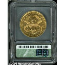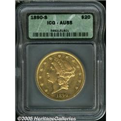 <B>1890-S $20 AU55 ICG.</B></I> DOLLARS is nicely die doubled, which provides an affordable opportunity to the variety specialist. The wingtips and the highpoints of the hair show friction, but the luster is extensive and the eye appeal is pleasing.