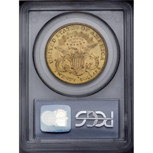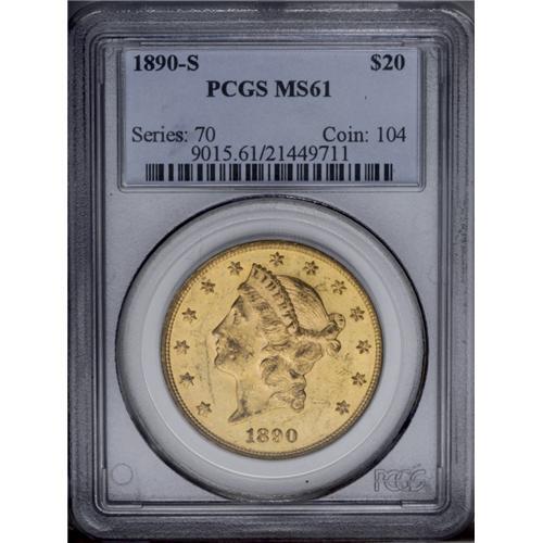 <B>1890-S<$20> MS61 PCGS.</B></I> A very scuffy appearance limits the grade, but this Mint State example is highly lustrous and displays crisply struck design motifs. <BR><BR><B>Important notice:</B> Heritage usually auctions material at the rate of 200-250 lots per hour. On some occasions eBay Live bid software or the Internet may not be able to keep up with the pace of the auction. We recommend placing a realistic absentee bid now as insurance to avoid disappointment. Occasionally the auctioneer may eliminate or reject an eBay Live bid, and the auctioneer may also reopen a lot after the close of the eBay live bidding (usually because we missed an audience bid), and may reject your bid even if it shows you as the winning bidder. By bidding via eBay Live, you agree that Heritage may award the lot to another bidder at its sole discretion under the circumstances described above or any other reasonable circumstances. Since eBay bids are not shown to us until we open the lot on the floor, we treat those bids just like floor bids. In most cases the floor responds before the eBay bid is presented to us, due to Internet lag time, so for consistency we have made it a policy that floor bids are always considered first over tie eBay live bids. Also please note that all Heritage lots purchased through eBay Live carry a 20% Buyer's Premium. Please make sure you read the Terms and Conditions before you bid. This lot is being auctioned in conjunction with a live floor auction by Heritage Galleries & Auctioneers. All final auction and invoice information will be supplied by Heritage Galleries & Auctioneers, and all other information should be considered preliminary. Lot:4324 <BR><BR><B>Winning Notification and Billing:</B> After the FINAL session in this auction is complete, Heritage will send e-mail and snail mail invoices. This process normally takes several days. All final auction and invoice information will be supplied by Heritage Galleries & Auctioneers, and all other information should be considered preliminary. <BR><BR>This auction will be conducted on a live auction floor and over the Internet through eBay Live. If you choose to place an absentee bid, please take a moment to <font color='#0000ff'><u><a href='http://pages.ebay.com/liveauctions/help/before/laabsentee.html'>learn how eBay Live absentee bidding works</a></u></font><font color='#000000'>