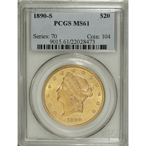 <B>1890-S $20 MS61 PCGS.</B></I> Intense coruscating mint frost flashes from the glassy surfaces of this well struck example. Numerous small to moderate blemishes limit the grade but not the eye appeal of the piece.<BR><BR><b>Shipping:</b> Coins & Currency (<a target="_blank" href="http://www.heritageauctions.com/common/shipping.php">view shipping information</a>)