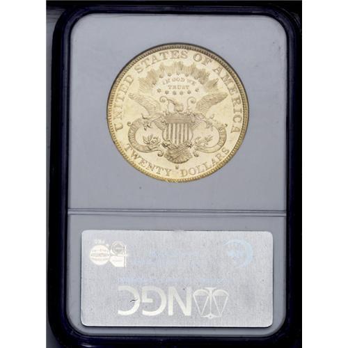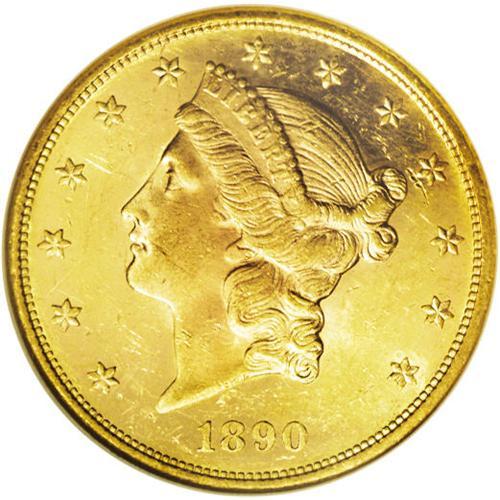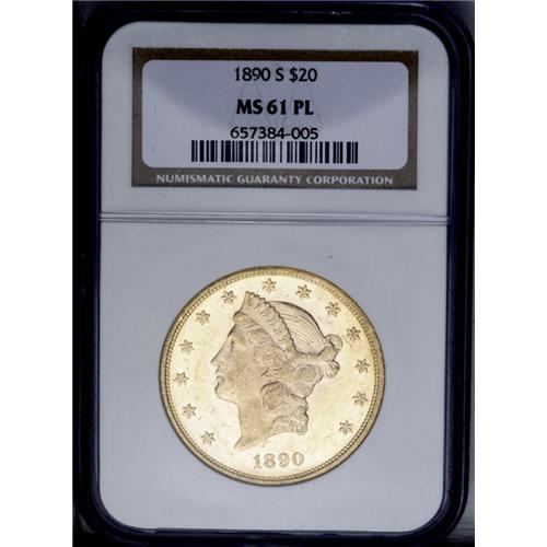 <B>1890-S<$20> MS61 Prooflike NGC.</B></I> A dramatically mirrored yellow-green Double Eagle that has aspirations to the Deep Mirror Prooflike designation. This attentively struck example has distributed moderate marks, as expected of the grade. This piece is the only one of this issue certified as prooflike by NGC (7/06).<BR><I>From The New York Eye Appeal Collection.</B></I>