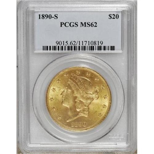 <B>1890-S $20 MS62 PCGS.</B></I> . PCGS Population (430/146). NGC Census: (320/77). Mintage: 802,750. Numismedia Wsl. Price for NGC/PCGS coin in MS62: $1,050. (#9015)<BR><BR><B>Coin Engraver:</B> James B. Longacre<BR><BR><b>Shipping:</b> Coins & Currency (<a target="_blank" href="http://www.heritageauctions.com/common/shipping.php">view shipping information</a>)