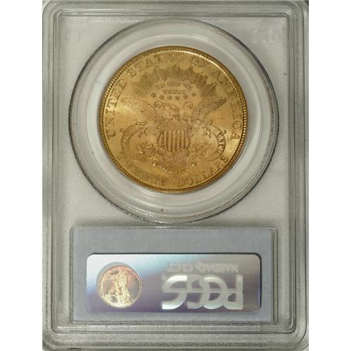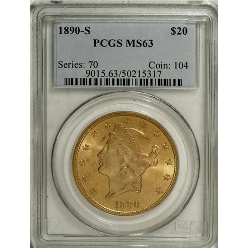 <B>1890-S $20 MS63 PCGS.</B></I> The scarcest S-mint from the 1890s, we have two Select examples to choose from in this auction. This particular coin has bright, satiny mint lustre along with deep orange-gold color with a subtle accent of lilac present. Sharply struck throughout with minimal abrasions for the grade.<BR><BR><b>Shipping:</b> Coins & Currency (<a target="_blank" href="http://www.heritageauctions.com/common/shipping.php">view shipping information</a>)
