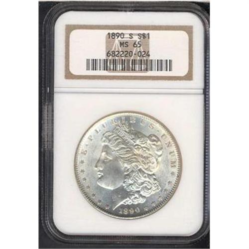 <b>1890-S Morgan Dollar. NGC graded MS65.</b> Swirls of silvery cartwheel luster with richer texture than average for an S-mint 1890. Devices not as sharp as a proverbial two-edged sword but still very acceptable for this S-mint issue, and strictly gem quality <b>(PCGS # 7202)</b>