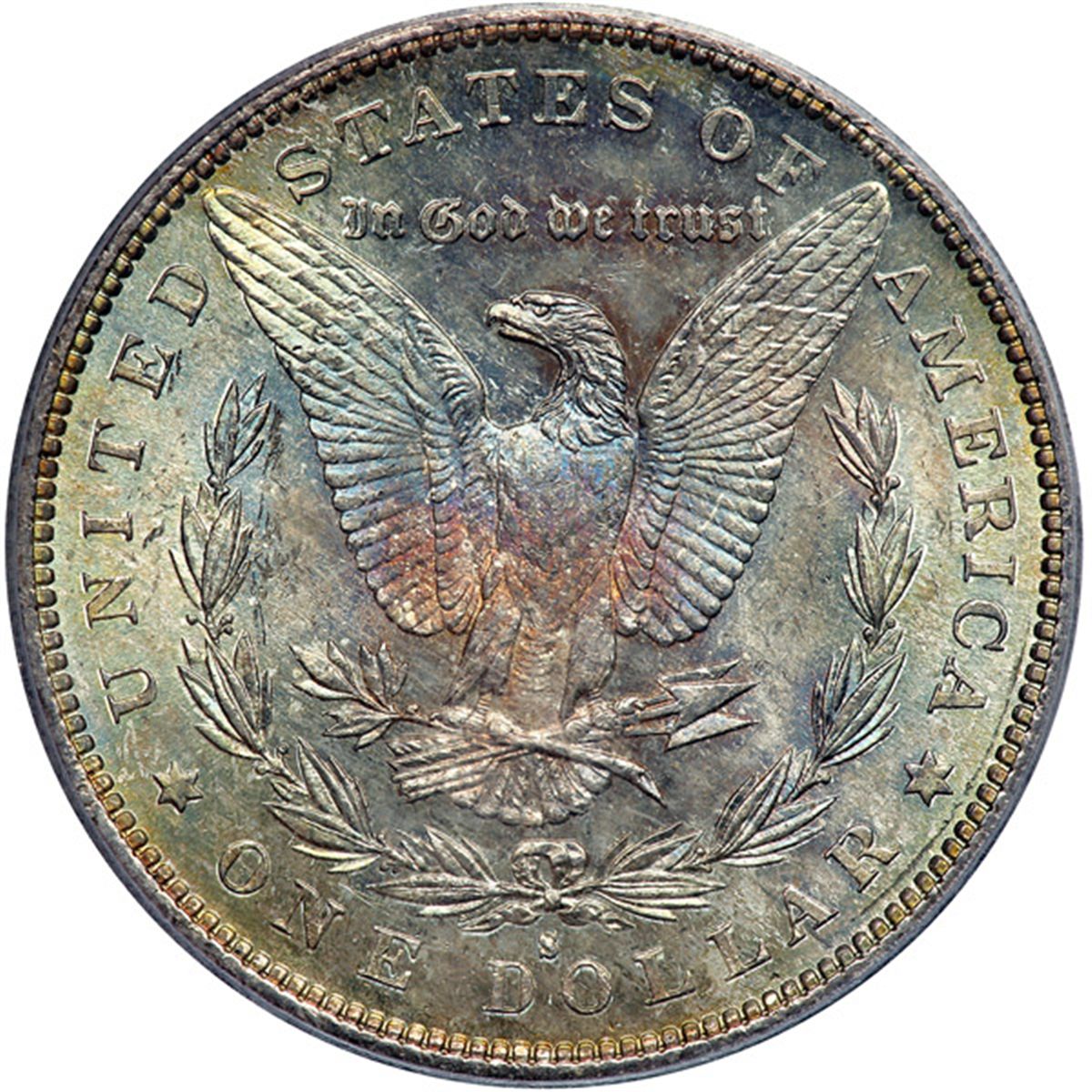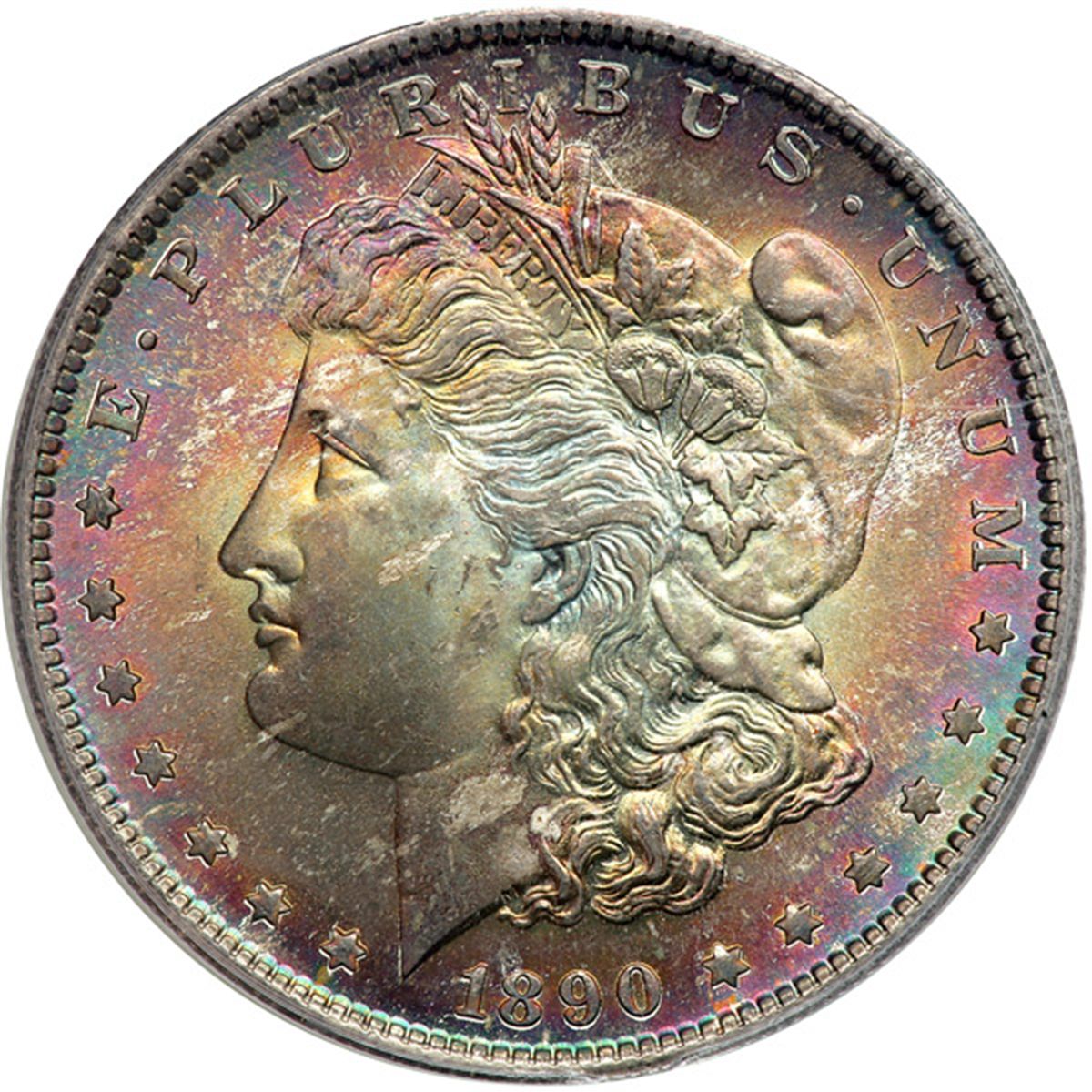 1890-S Morgan Dollar. PCGS graded MS-66. The obverse displays lovely rainbow toning while the reverse shows light rainbow colors. A highly lustrous Gem that has swirling luster throughout and a razor sharp strike. And what's more, confirming the smooth luster, we report excellent sharpness on all central features. Pop 125; 7 finer (PCGS # 7202) .
