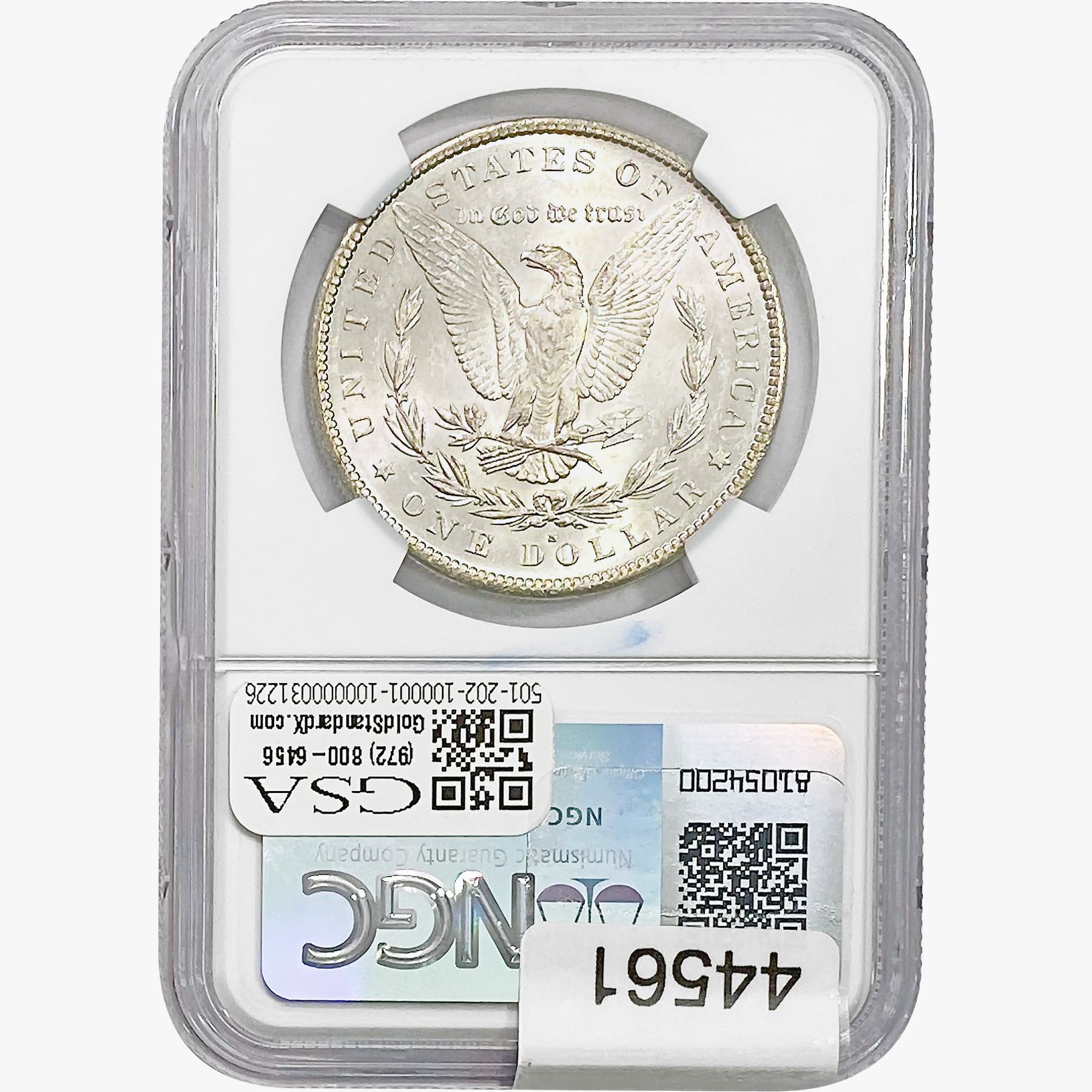 e. Coins sold referencing a third-party grading service are sold “AS IS” without any express or implied warranty, except for a guarantee by GSA that they are genuine. Removal or alteration of the holder, voids all of Bidder’s claims concerning that Product. Certain warranties may be available from the grading services and Bidders are referred to them for further details: Numismatic Guaranty Corporation (NGC), PO Box 4776, Sarasota, FL 34230, www.ngccoin.com/services/writtenguarantee.asp; Professional Coin Grading Services (PCGS), PO Box 9458, Newport Beach, CA 92658, www.pcgs.com/guarantee.html; ANACS, 6555 S. Kenton St., Ste. 303, Englewood, CO 80111; and Independent Coin Grading Co. (ICG), 7901 East Bellview, Ave., Suite 50, Englewood, CO 80111.