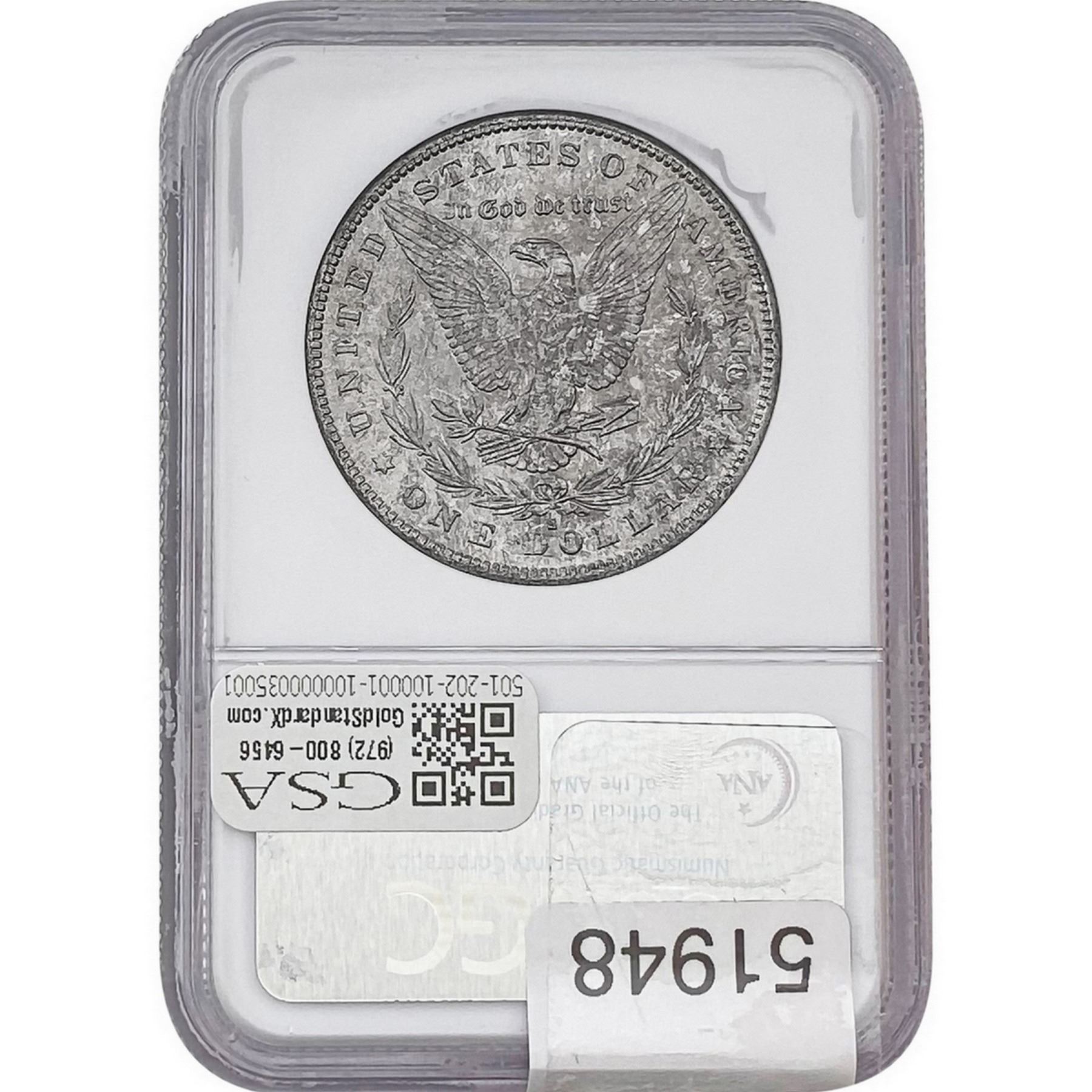 l. All non-certified coins and currency are guaranteed genuine, but are not guaranteed as to grade, since grading is a matter of opinion, an art and not a science, and therefore the description rendered by GSA or any third-party grading service may not agree with the opinion of others (including trained experts), and the same expert may not grade the same item with the same grade at two different times. GSA may, but is not obligated to, express an opinion as to non-certified numismatic items, in GSA’s opinion, or by its employees’ experience and the current interpretation of the American Numismatic Association’s standards as of the date the catalog was prepared. There is no guarantee or warranty expressed or implied that the grading opinions utilized by GSA, if any, will meet the standards of any grading service at any time in the future.
