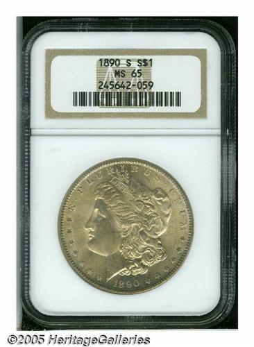 <B>1890-S<S$1> MS65 NGC.</B></I> Pleasing luster radiates from the lightly toned, lovingly preserved surfaces that show only a couple of trivial ticks. The strongly impressed design elements further enhance the beauty of this gorgeous S-mint Morgan.