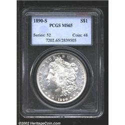 1890-S S$1 MS65 PCGS. Screaming white brilliance with pinpoint striking and noticeable reflectivity. Important notice: We expect to be auctioning lots at the rate of 200-250 per hour. Sometimes eBay Premier live bid software cannot keep up with that pace, so we strongly recommend that you place a realistic proxy bid now as insurance to avoid disappointment. Also please note that all Heritage/CAA lots purchased through eBay Premier carry a 20% Buyer's Premium.