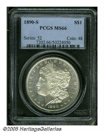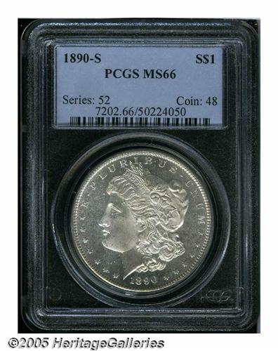 <B>1890-S<S$1> MS66 PCGS.</B></I> The 1890-S is another Redfield dollar that is available in Gem and lower grades, but MS66 coins are quite elusive. This is a splendid, highly lustrous example that has semi-prooflike fields. Brilliant throughout with pinpoint striking definition, there are no obvious abrasions on either side. An outstanding, high grade example and a coin that is worthy of close examination. Population: 103 in 66, 5 finer (6/05).