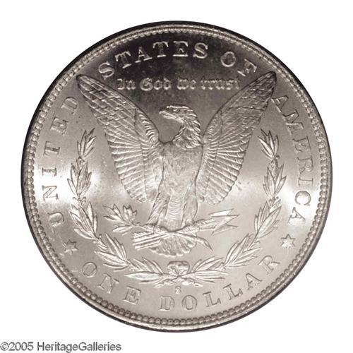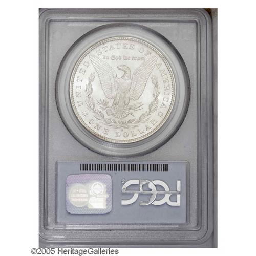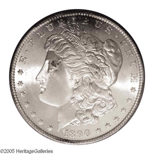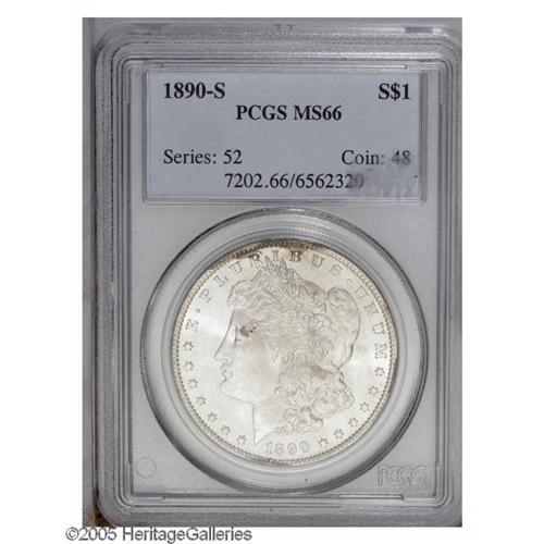 <B>1890-S<S$1> MS66 PCGS.</B></I> Well struck and carefully preserved, the cheek of Liberty is remarkably free from contact marks, as is the remainder of the coin. The thick mint luster is fully white and untoned, except for small smudges of dark patina on Liberty's eyebrow and temple, and along the upper obverse denticles. A sharp looking example of this scarce and popular S-mint issue. Population: 108 in 66, 5 finer (10/05).