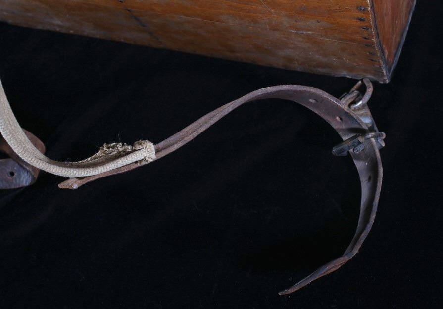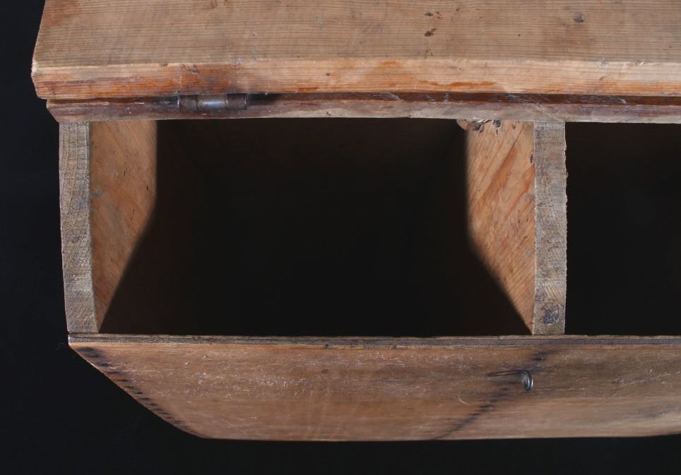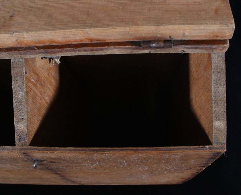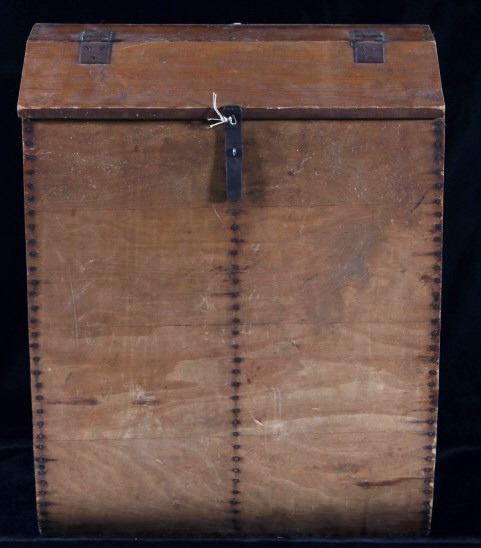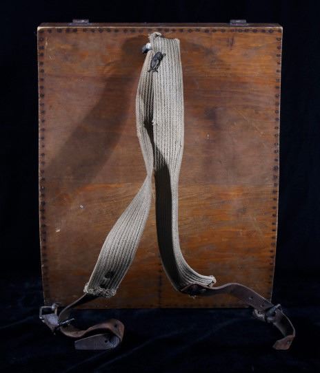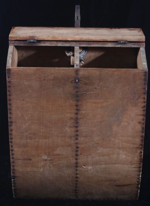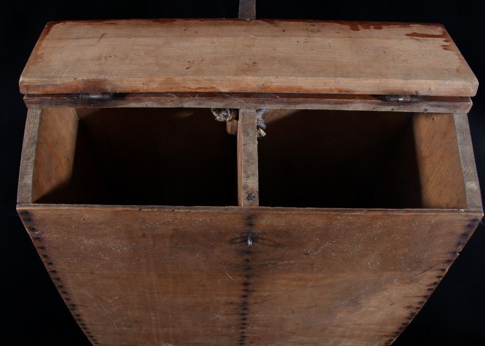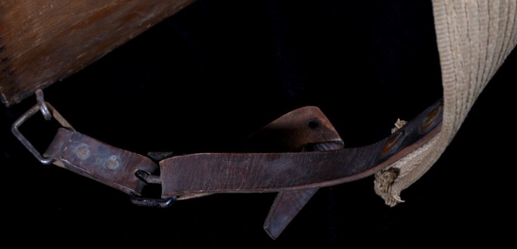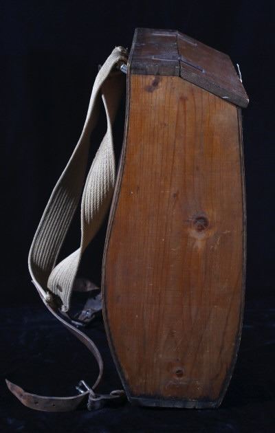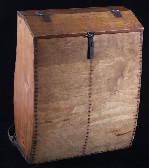 Featured in this lot we have a Scandinavian wooden backpack originating from the 1890's. The backpack shows wood panel construction with woven shoulder straps. This piece shows a simple slightly curved design with a opening hatch at the top and two storage sections on the interior. The back pack was used to transport more fragile or delicate items. The piece shows good condition overall with some minor wear across the pack due to use and age. The backpack measures 15 1/2" wide by 19 1/2" tall and 8" thick.