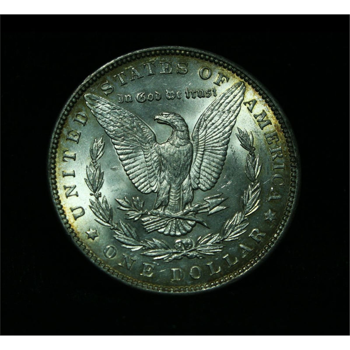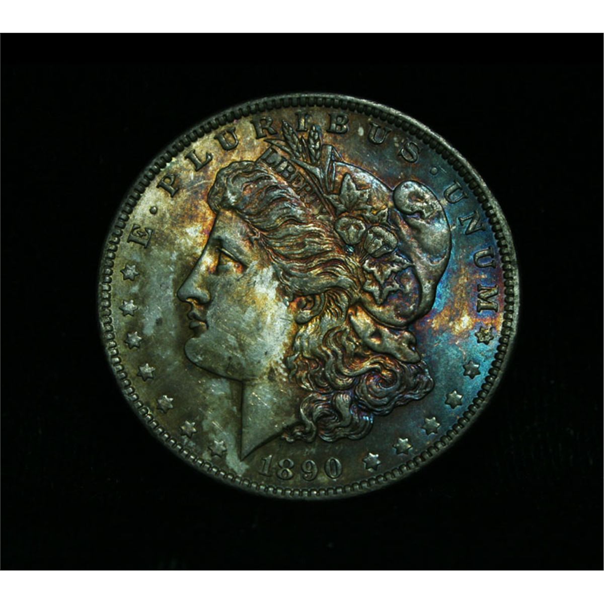 Striking blues on the right side of the obverse highlight this very colorful rainbow toned Morgan. Very high end ms64, possible 65 on a good day. Great luster and nice strike plus very nice rim toning on the reverse. A really great coin. The Wholesale Greysheet lists a regular ms64 at $130 and a regular ms65 at $2150. This coin is not a regular 1890-P due to its rainbow toning. Estimated Value $250.