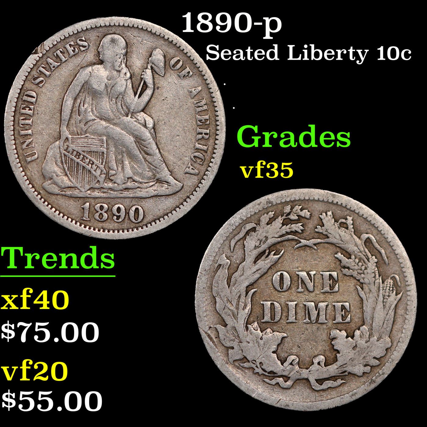 1890-p Seated Liberty Dime 10c Grades vf++.