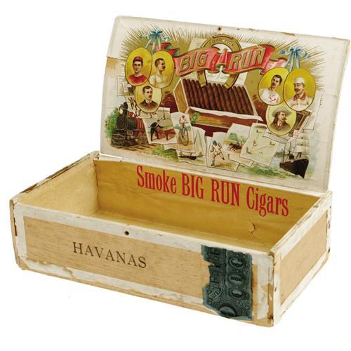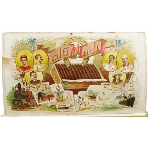 <B>1890's "Big Run" Cigar Box with Buck Ewing.</B></I> Don't let the rather nondescript exterior fool you--much like Pandora's, this box has its excitement hidden within. A gorgeously lithographed label on the interior lid offers a cornucopia of portraiture depicting the top celebrities of the day. Hall of Fame New York Giant Buck Ewing will likely be of greatest interest to our sports collecting clientele, but we must also mention William F. "Buffalo Bill" Cody, Percy Stone (jockey), Jacob Schaefer Sr. (billiards), L. E. Myers (runner), and James Albert (pedestrian). The label shows some paper loss at left edge that does not encroach upon the portraiture, a few small, unobtrusive wrinkles due to some warping of the lid, and a nail hole at top. Otherwise both the lid and the box to which it remains attached present very nicely. A fine artifact from the bygone days when athletics and tobacco were still a happy couple.<BR><BR><b>Shipping:</b> Miscellaneous Collectibles, Smal (<a target="_blank" href="http://www.heritageauctions.com/common/shipping.php">view shipping information</a>)