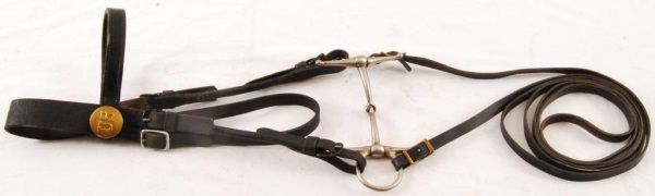 1890's black military bridle with snaffle bit and reins. Probably artillery.