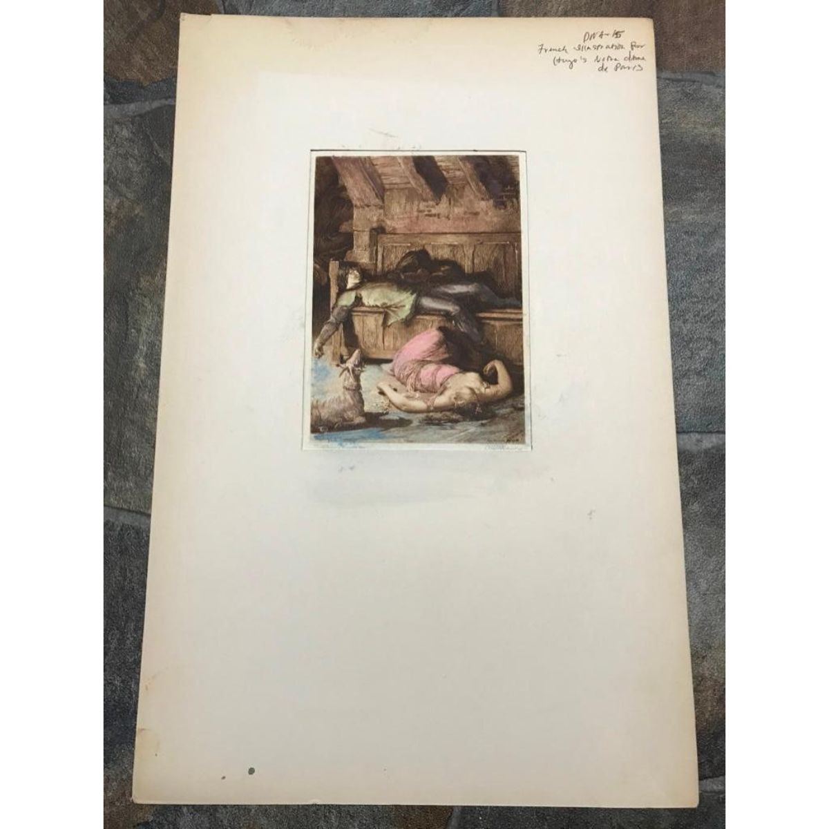 1890's French hand-colored engraving, illustration from Hugo's Notre Dame de Paris by Luc Olivier Merson ( French 1846 - 1920 ). 5 1/4" X 7 1/4" displayed in 11 1/2 X 17 1/2" portfolio. * watercolor was heavy on this engraving & bled into the margin. script handwriting to the outside upper right of the portfolio with an inventory #, as well as smudging & staining. lowered reserve reflects this damage.