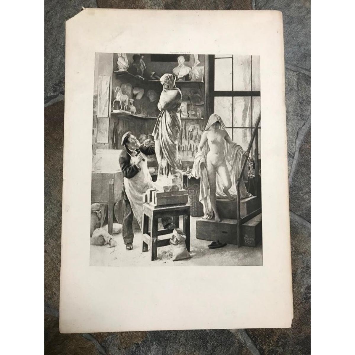 1894 black & white photogravure print by G.B. of Edouard Joseph Danton's original, 1891 painting "A Restoration" depicting an artist, sculptor in his studio with a model. 11 1/2" X 17".Â
