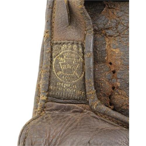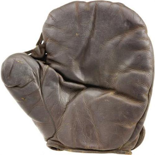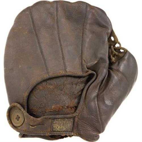 <B>1890's Reach Button-Back Glove.</B></I> Fine early specimen was state of the art during the era of King Kelly and Cap Anson despite the fact that it bears a closer similarity to a pot holder than baseball gloves of today. These ancient button-back gloves are typically fraught with condition problems, with many losing the delicate wrist strap or the webbing between the thumb and index finger. Such is not the case here, as the deep brown leather has weathered the passing decades with few problems. Only the seam that holds the palm padding in place is at issue here, and this has no real effect upon the display. The proper period "Reach" label remains firmly affixed at the base of the wrist strap, and the original button holds that strap in place. A tremendously attractive piece for the avid baseball historian.<BR><BR><b>Shipping:</b> Miscellaneous Collectibles, Smal (<a target="_blank" href="http://www.heritageauctions.com/common/shipping.php">view shipping information</a>)