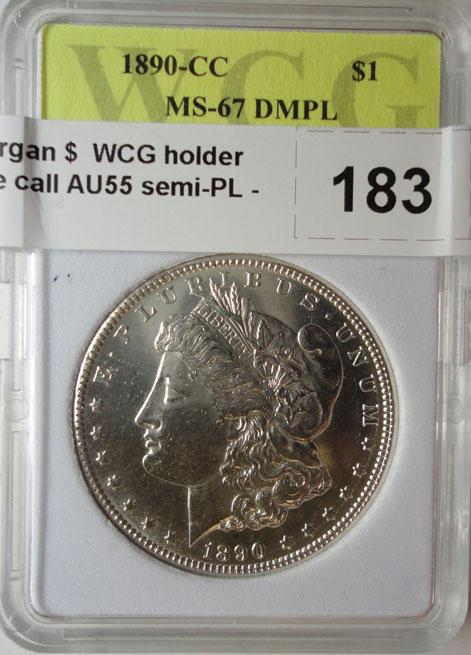 1890CC Morgan $ WCG holder 67DMPL we call AU55 semi-PL