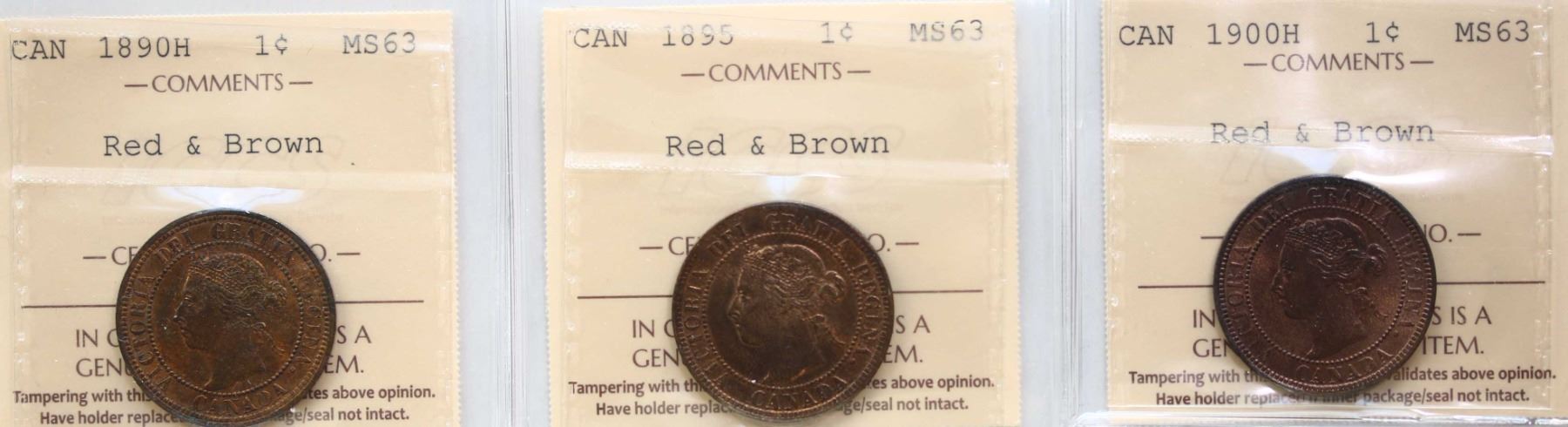 1890H 1¢, 1895, 1900H, All 3 coins ICCS Choice Mint State-63 RB.