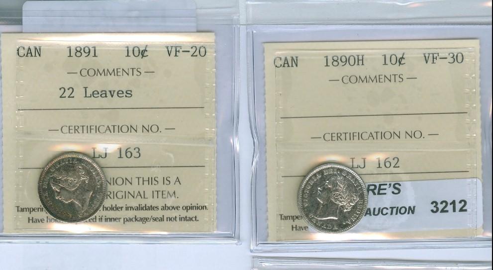 1890H 10¢ ICCS VF-30; 1891, 22 Leaves. ICCS VF-20. Lot of two (2) coins. Both with light to medium heavy toning.