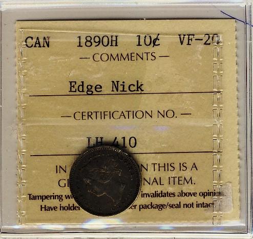 1890H 10¢ ICCS VF20 Edge Nick