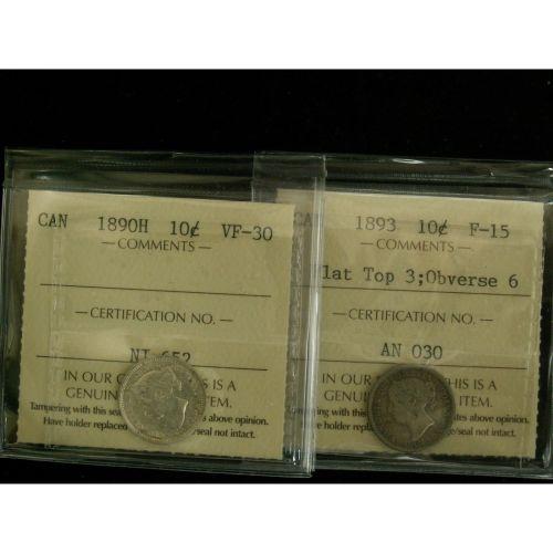 1890H 10¢ VF-30 ,1893 Flat Top Obv 6 10¢ F-15, both ICCS graded