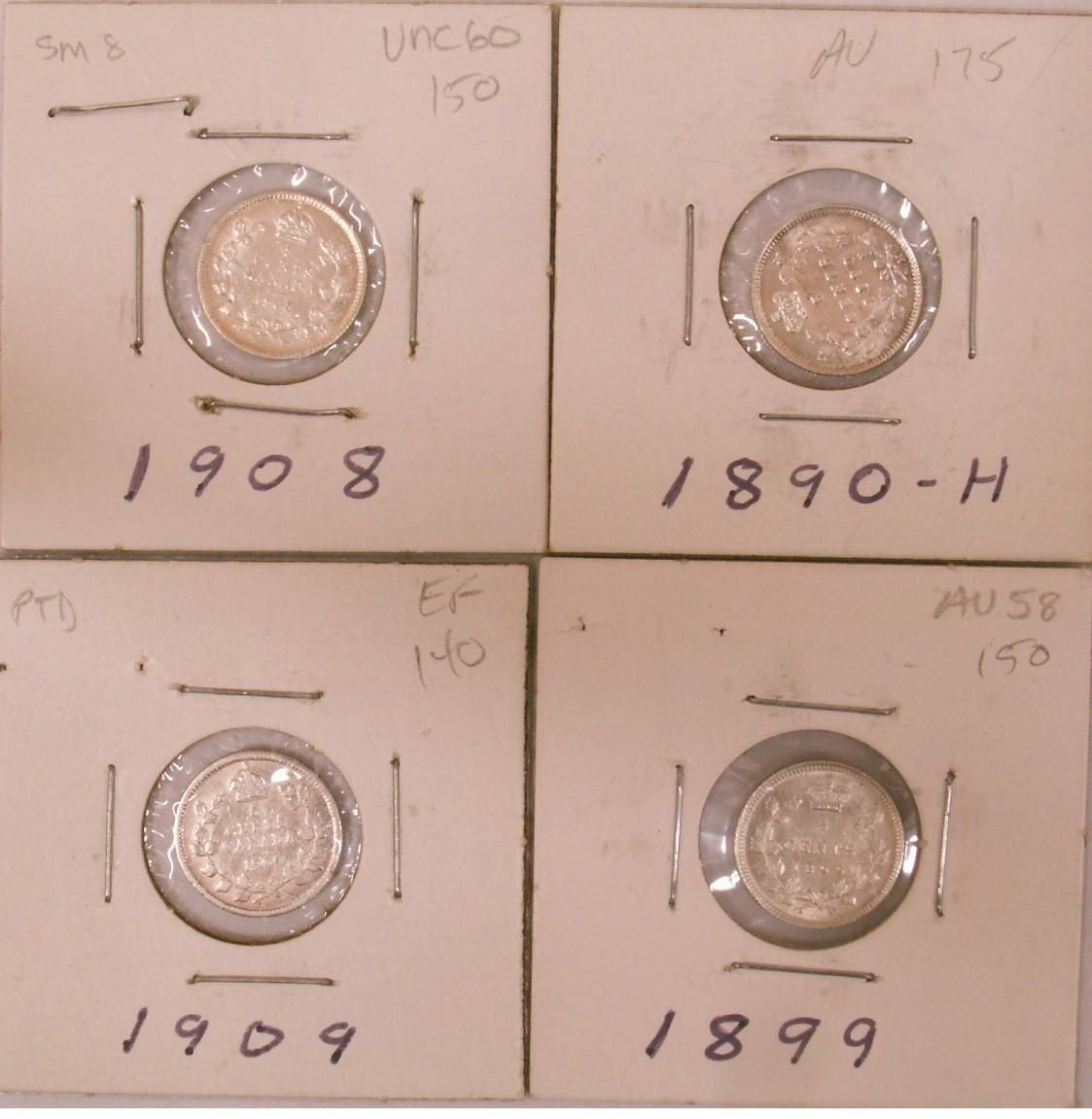 1890H, 1899, 1908 & 1909 5¢. Lot of 4 coins EF to AU.