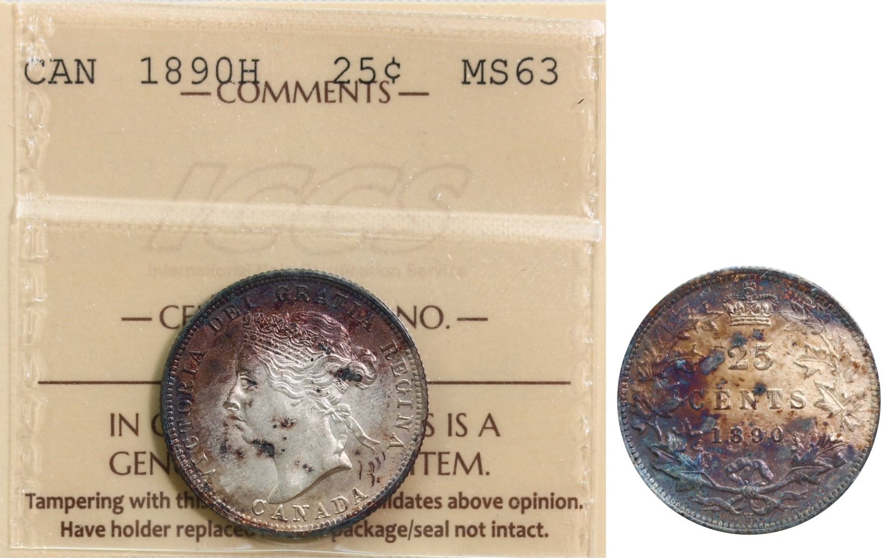 1890H 25¢ ICCS Choice Mint State-63. A tough date to find in this condition. Not often seen and offered.