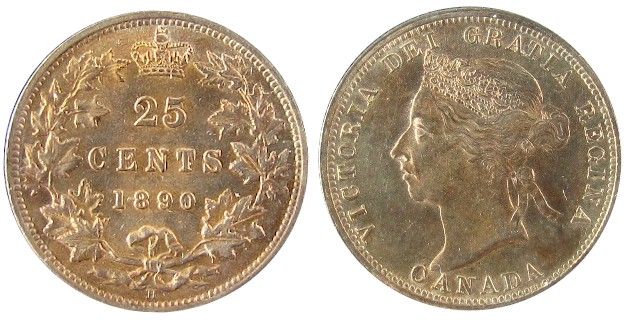 1890H 25¢ ICCS MS64. Attractive russet tones over full underlying lustre. Scarce in near Gem condition.