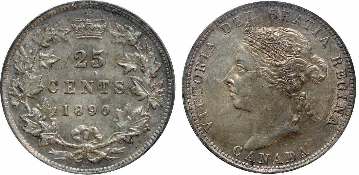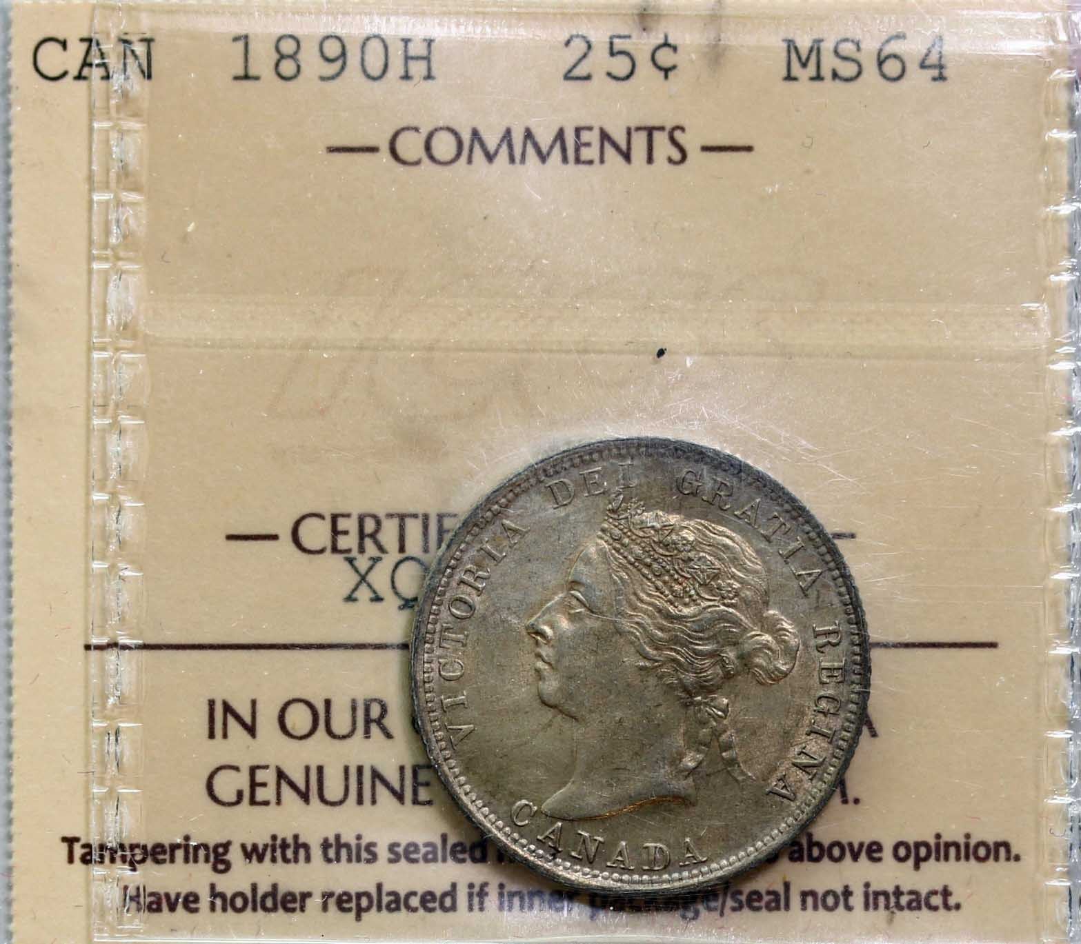 1890H 25¢ ICCS Very Choice Mint State-64 Light pink, gold and champagne tones over full underlying lustre. Scarce date seldom seen and offered.