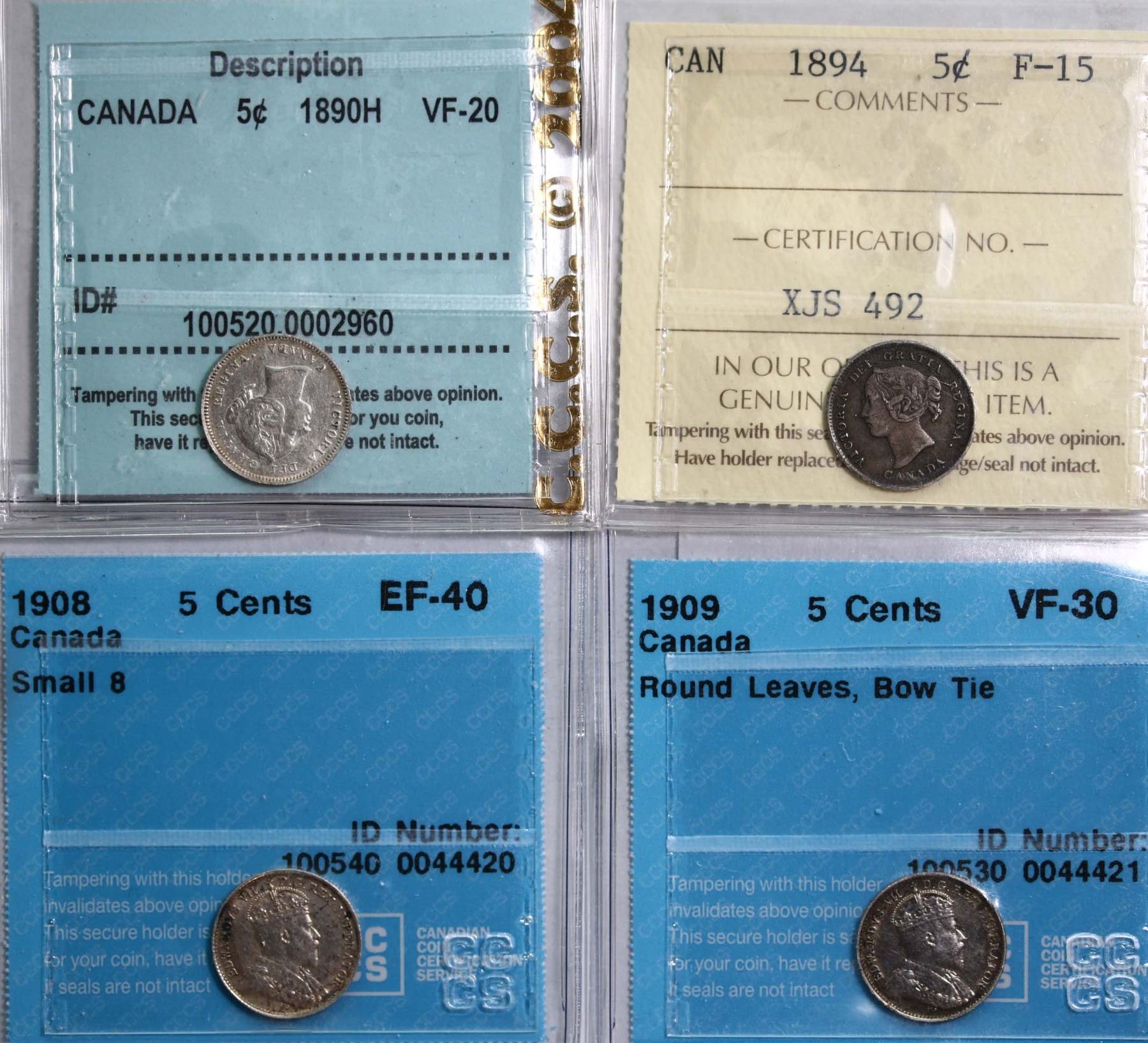 1890H 5¢, 1894, 1908 ¨Small 8¨, 1909 ¨RL, BT¨All 4 coins ICCS/CCCS Choice Fine-15 to Extra Fine-40.