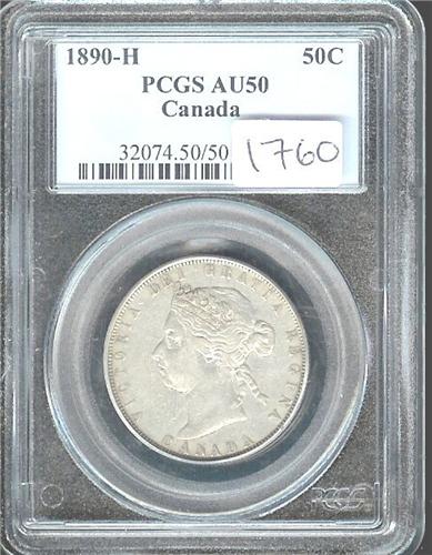 1890H Obverse 4, PCGS AU-50, Lightly toned but mostly brilliant, key date. Rare in this grade.