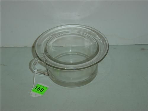 CLEAR GLASS CHILD'S CHAMBER POT. STANDS 3" TALL WITH A 6.5" DIAMETER. AS SHOWN. VIEW PICTURE FOR DETAIL.