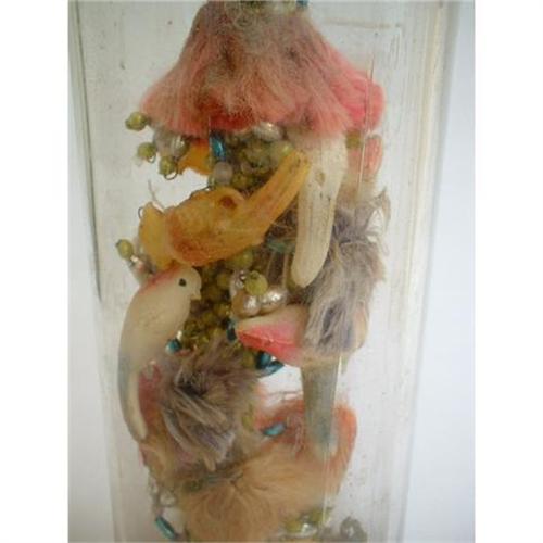 Up for auction a rare most and an unusual construction in glass bottle from 1870+.The construction is around the wooden stick having hundereds of beads and flowers made of thin threads of various colors . The bottle houses various different color birds and children made of the widely used material of 1800's " CELLULOID " which is replaced by plastic today. This would be fine addition to a advance collector .