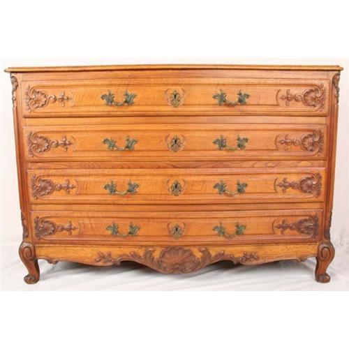 Belgian Oak Louis XV Chest of Drawers. Original hardware and elaborate carving make for a beautiful piece! All drawers open although keys not included. Professional wood repair to right corner of second drawer from the bottom does not affect the beauty or utility of this piece. At EuroLux, our customer's happiness is our top priority. For this reason, we go to great lengths to fully, honestly and accurately describe our pieces. As we hand-select all of our pieces personally, we only buy high-quality items. However, please keep in mind that there is no such thing as a new antique or vintage item, and normal wear associated with these items is to be expected.