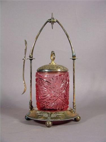 1890s Pickle Caster, cranberry and pink insert by the Meriden Silver Company # 97 frame. 12 inches tall.