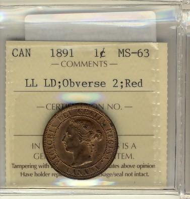 1891 1¢ LL LD Obv 2 ICCS MS63RD.