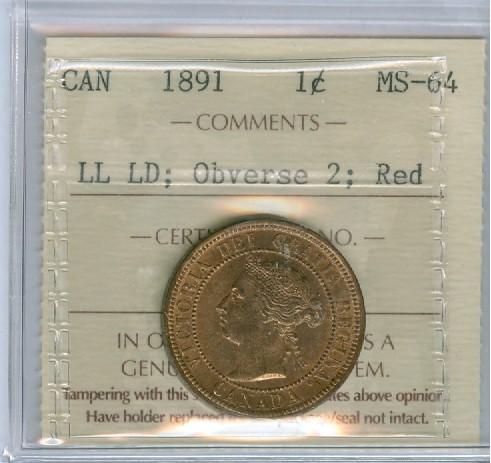 1891 1¢ LL LD, Obv 2 ICCS MS64RD. Lustrous 90% red.