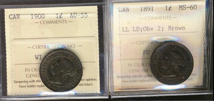 1891 1¢ LL LD Obv 2 MS60 & 1900 AU55. Lot of 2 ICCS graded coins.