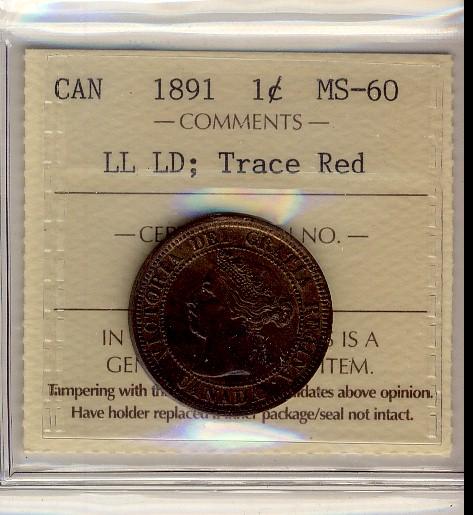 1891 1¢ LL LD, Trace Red ICCS MS60.