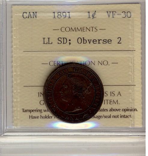 1891 1¢ LL SD Obv 2 ICCS VF-30
